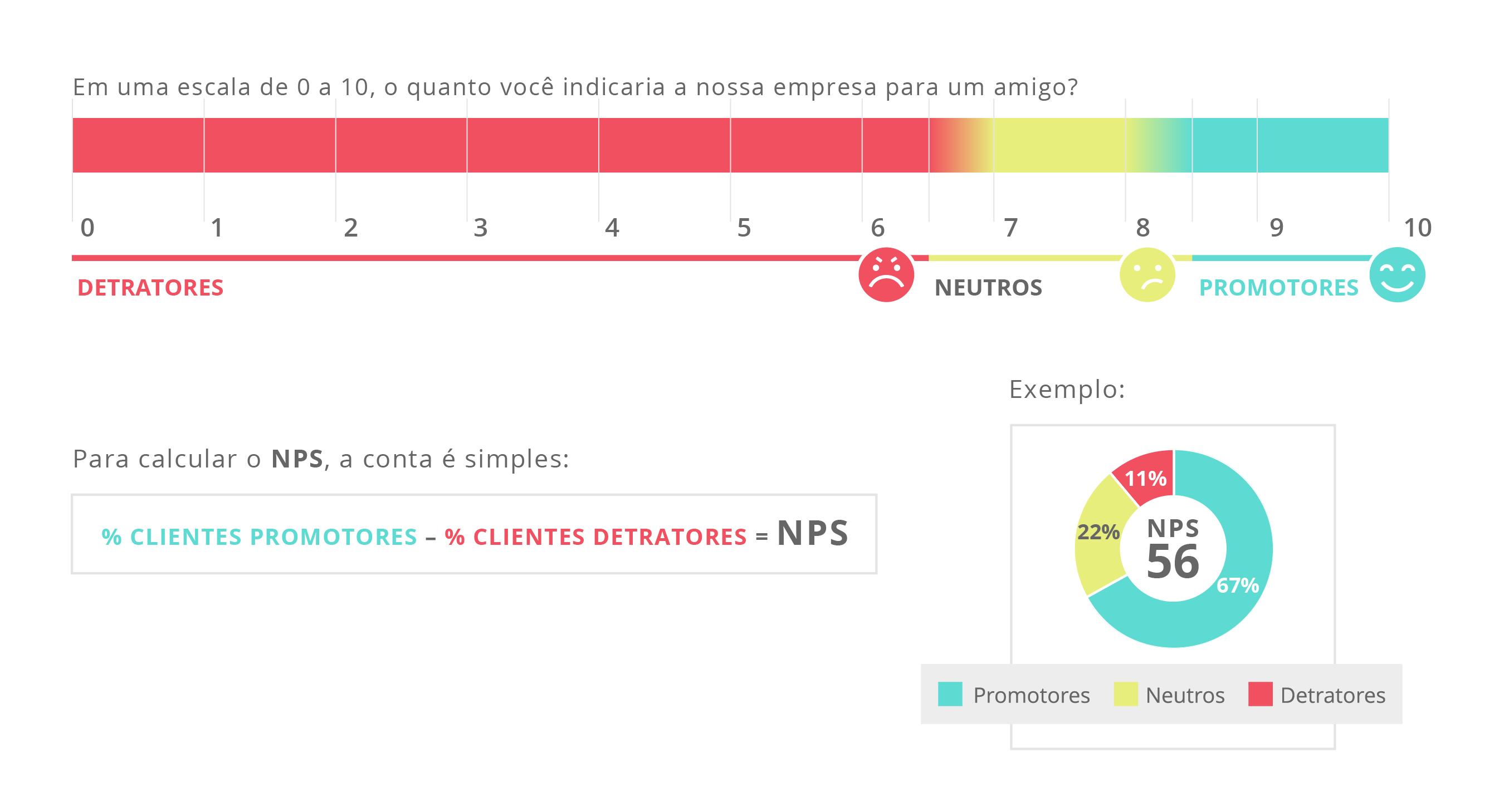 NPS (Net Promoter Score) é uma métrica usada para medir a satisfação dos clientes, através da questão "De 0 a 10, qual a probabilidade de recomendar o serviço a familiares e amigos?"